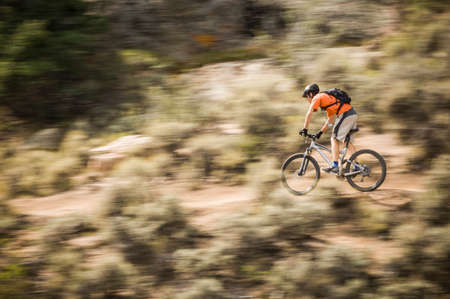 A cyclist in a helmet descends from the mountain on an orange bicycle, motion blur.