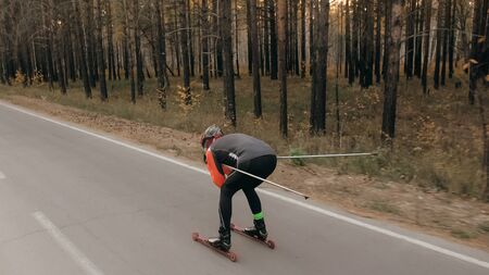 Skateboarder ride a longboard skateboard on the road through the forest. Freeride longboard skating. Panorama view