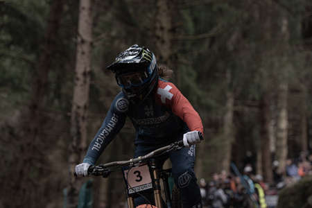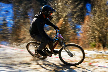 Unidentified cyclist in action at the mountain bike race in Almaty, Kazakhstan.