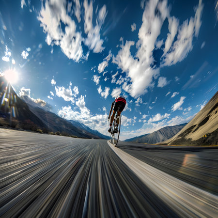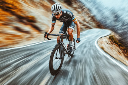 A cyclist speeds along a curvy road through picturesque mountains at dawn, showing athletic skill and determination.