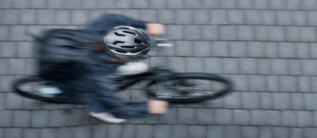 Blurred view of a man cycling through an urban street scene,.