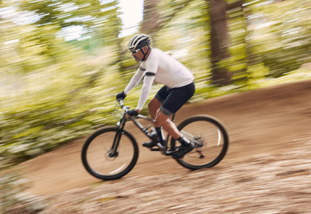 Blur, race and man cycling in nature training for a competition on trail in forest or woods. Action, sports or fast cyclist athlete riding bicycle at speed for cardio exercise, fitness or workout