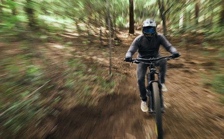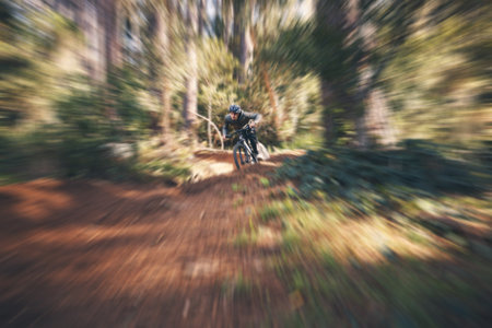 Mountain biker speeding down a trail in the forest, experiencing the thrill of the ride
