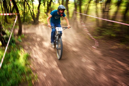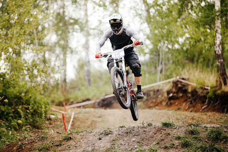 Sport race Mountain biker extreme and fun downhill track. Jumps and dirt splashes.