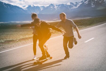 Group of friends run, laugh and having fun. The guy on longboard. Asphalt road.