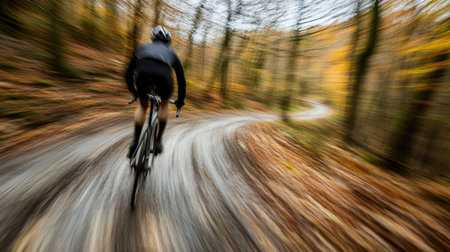 A cyclist rides down a road lined with fall foliage, with leaves scattered around. The motion blur creates a sense of speed and movement through autumn.