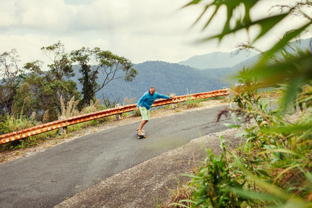 hipster man longboarding extremely in tropics vacation