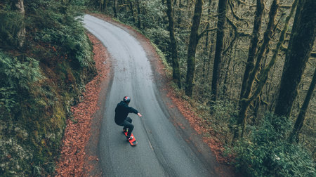 Skateboarder riding on the road in the forest. Outdoor lifestyle