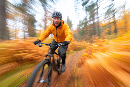 Mountain biking through autumn forest, solo adventure generated by artificial intelligence