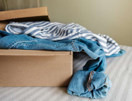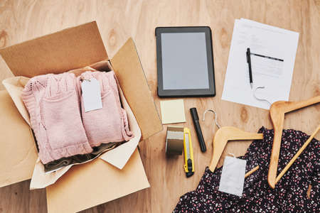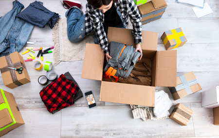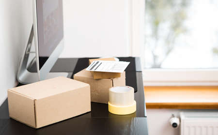 Packing online order to delivery to customer. Preparing parcel box with clothes product from online shop