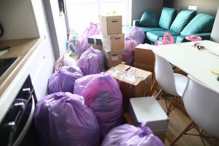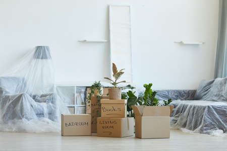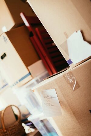 Image of heap of signed cardboard boxes in the room prepared for relocation