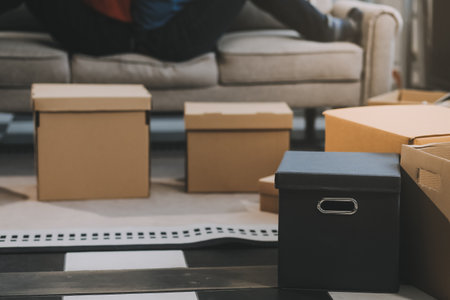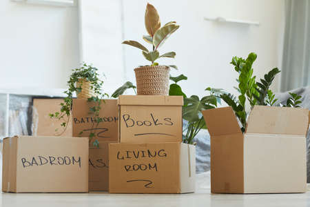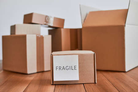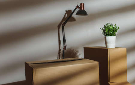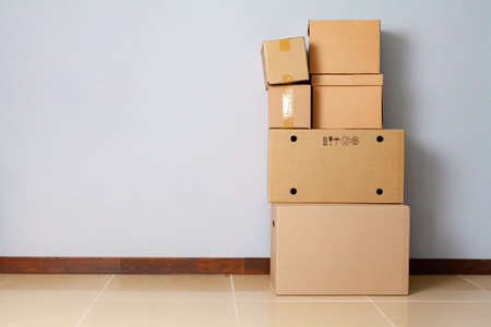 Close-up of room with stack of cardboard boxes. Organized stuff in carton and packages. New apartment or house. Just acquired property. Moving day and renovation concept