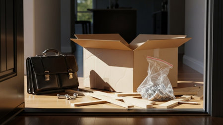 Unpacked cardboard boxes, suitcase, travel mug, and keys on cabinet suggesting young couple moving into new home and preparing for renovations with household items scattered around