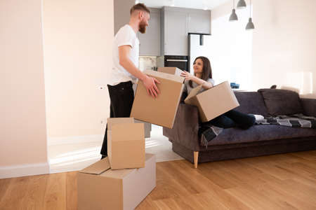 Young couple with big boxes moving into a new house, new apartment for couple, young man and woman helping to lift boxes and organize things for the new home, Moving house.