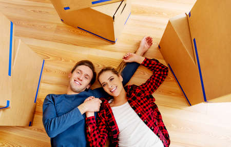 Happy couple lying on the floor in new home with cordboard boxes around.