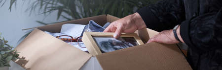 Close-up of hands placing a framed photo and a mug into a cardboard box, surrounded by other packing materials. The image represents the process of moving house, preserving memories, and the transition to a new home.