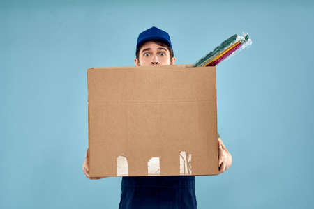 A man in working uniform with boxes in the hands of a carriage delivery service blue background
