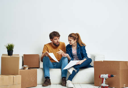 Man and woman are sitting on sofa with boxes of tools moving interior