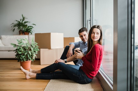 Young couple with cardboard boxes moving in a new home, sitting on a floor.