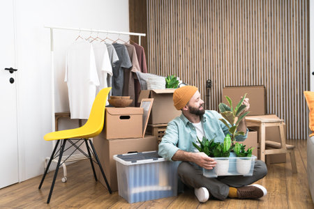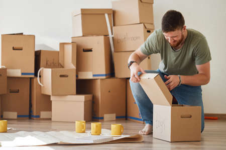 Hipster man with moving boxes in new modern apartment. Mature man unpacking things from boxes while moving in new apartment.