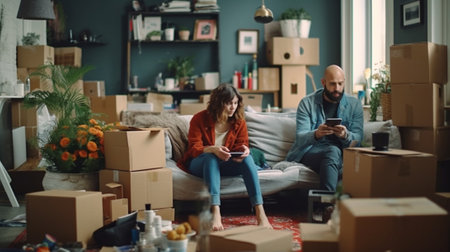 Generative AI : Positive young man and woman browsing laptop and searching for items for new home while sitting on sofa in room with carton boxes