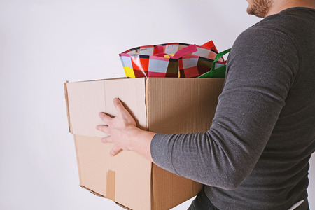 Man holds a box with an office. Concept - termination of the employment contract. Box fired in hands of a human. Concept - termination of employment. Concept - mass layoffs. Moving to a new office