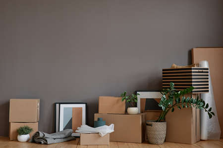 Horizontal no people shot of unpacked boxes and various stuff placed in loft room against gray wall