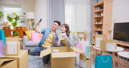 Happy asian couple receive packing parcel after online shopping at home and they takes selfie with new pot in opening delivery box