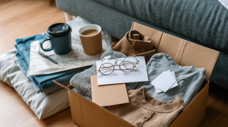 A box full of clothes and a mug of coffee. Concept of comfort and relaxation