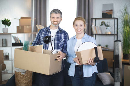 Caucasian middle aged couple in casual wear smiling and hugging at new flat, holding boxes with different decor and things. Young family moving to modern apartment. Cardboxes around.
