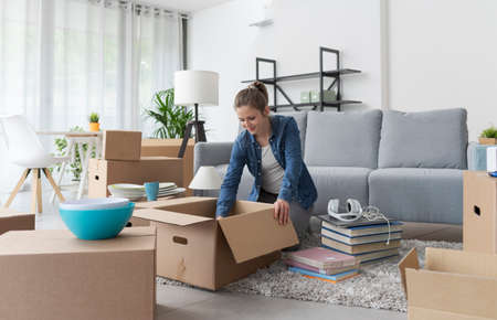 Young happy woman doing a home relocation, she is unpacking in the living room