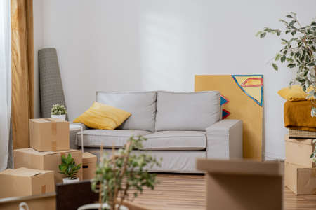 Apartment while moving, cardboard boxes with stuff, brought couch, renting, buying, selling property, freshly renovated