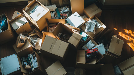 Stack of cardboard box on floor laminate background. Empty box case top view. Moving or relocation concept