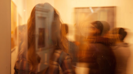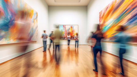 People walking through an art gallery, admiring contemporary paintings hanging on wall, modern abstract art and clean, minimalist interior create a calm atmosphere