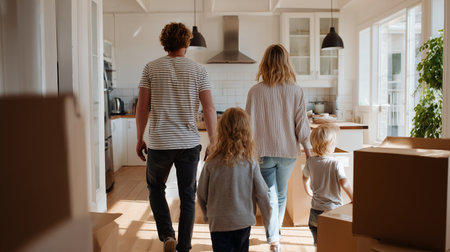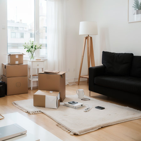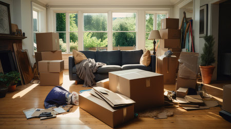 The family has just moved into their new home and is in the middle of unpacking boxes and placing furniture. The living room is cluttered with boxes, bubble wrap, and scattered furniture pieces.