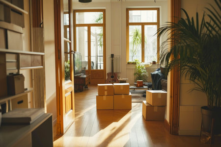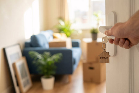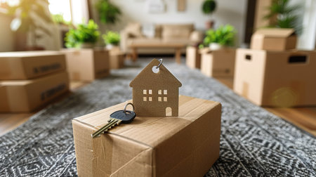 Open door showcases keys while revealing a cozy living room filled with unpacked boxes, soft lighting creating a warm ambiance, representing happiness and new beginnings