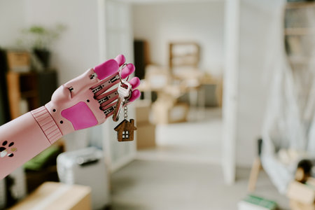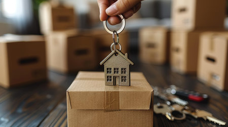 Woman with prosthetic hand holding house key with small house keychain in modern apartment during moving and renovation process, cardboard boxes visible in background