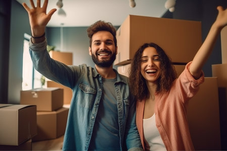 A man and a woman standing in front of cardboard boxes. Generative AI image.