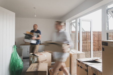 Slow shutter speed shot of a mature couple moving boxes in their new home.