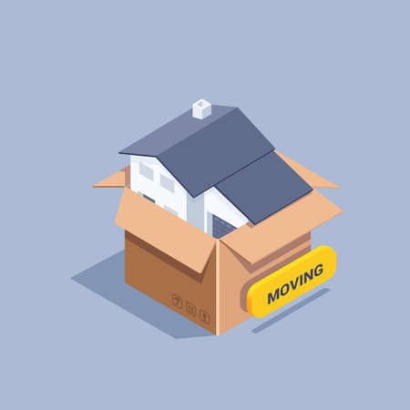 isometric vector illustration on gray background, house in box and button with inscription moving, office and house relocation service