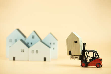 Model wooden home being transported by a scale toy forklift truck. moving home concept. Choosing a new home to buy. The buyer chooses a house. Real estate investment.
