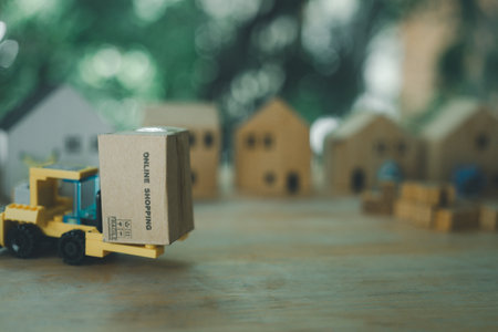 Mini forklift truck load cardboard box with text online shopping. Transportation management ideas and Industry business commercial concept.