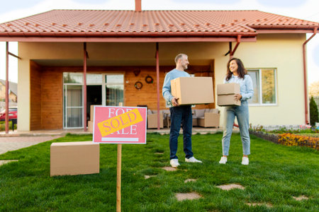 Focus on SOLD sign and happy spouses carrying cardboard boxes, standing in front of house on background, full length shot