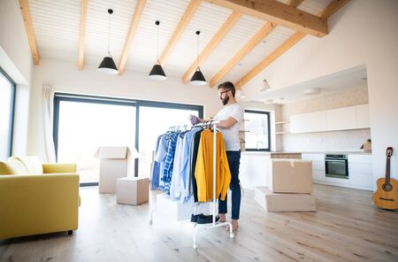 Mature man with boxes and clothes rack moving in new unfurnished house.