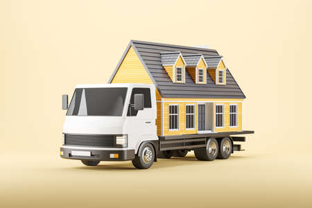Delivery van with a big house, side view on beige background. shipping company. Concept of moving and delivery. 3D rendering