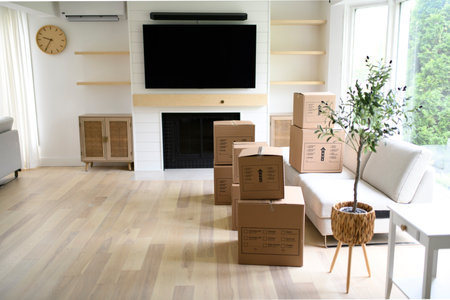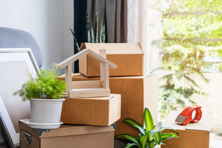 Cardboard boxes stacked, plants, comfortable couch near big window inside of modern living room in new house, celebrating moving to new home concept, no people. top view