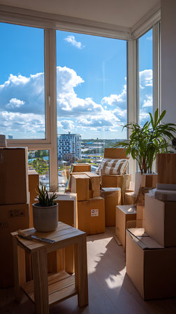 Interior shot of an apartment on move-in day filled with cardboard boxes, plants, and furniture. Views of the city can be seen through the large windows.