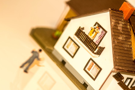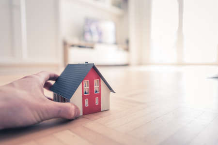 Miniature wooden toy house against the background of a man with boxes. Mortgage property insurance dream home concept. Buying new house for family