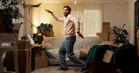Moving, dancing and man in new home with boxes with fun for property investment with music. Happy, goofy and male person listening to playlist, song or radio with groove in living room at house.