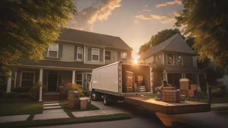 A white moving truck is parked in a peaceful residential neighborhood, surrounded by trees at sunset. The warm light creates a welcoming atmosphere, perfect for logistics and transport themes.